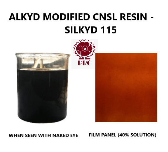 INTRODUCTION: Silkyd 115 are CNSL modified with Long Oil Alkyd based Phenolic Resins. The Alkyd Modified Phenolic Resins are very popular in the Paint Industry. They were introduced primarily to reduce costs and to improve the drying time. But these advantages are gained at the cost of sharp deterioration of the properties of the original Alkyd particularly it’s chemical & water resistance & outdoor durability properties. Keeping these in consideration we have developed these resins. It reduces the drying time, improve the resistance to chemical & water & outdoor durability, yet the cost is lower than the Alkyds. They are Golden Reddish in colour and are suitable for Semi Dark colored & Dark colored Synthetic hard glossy enamels, insulating varnishes having outstanding film properties.